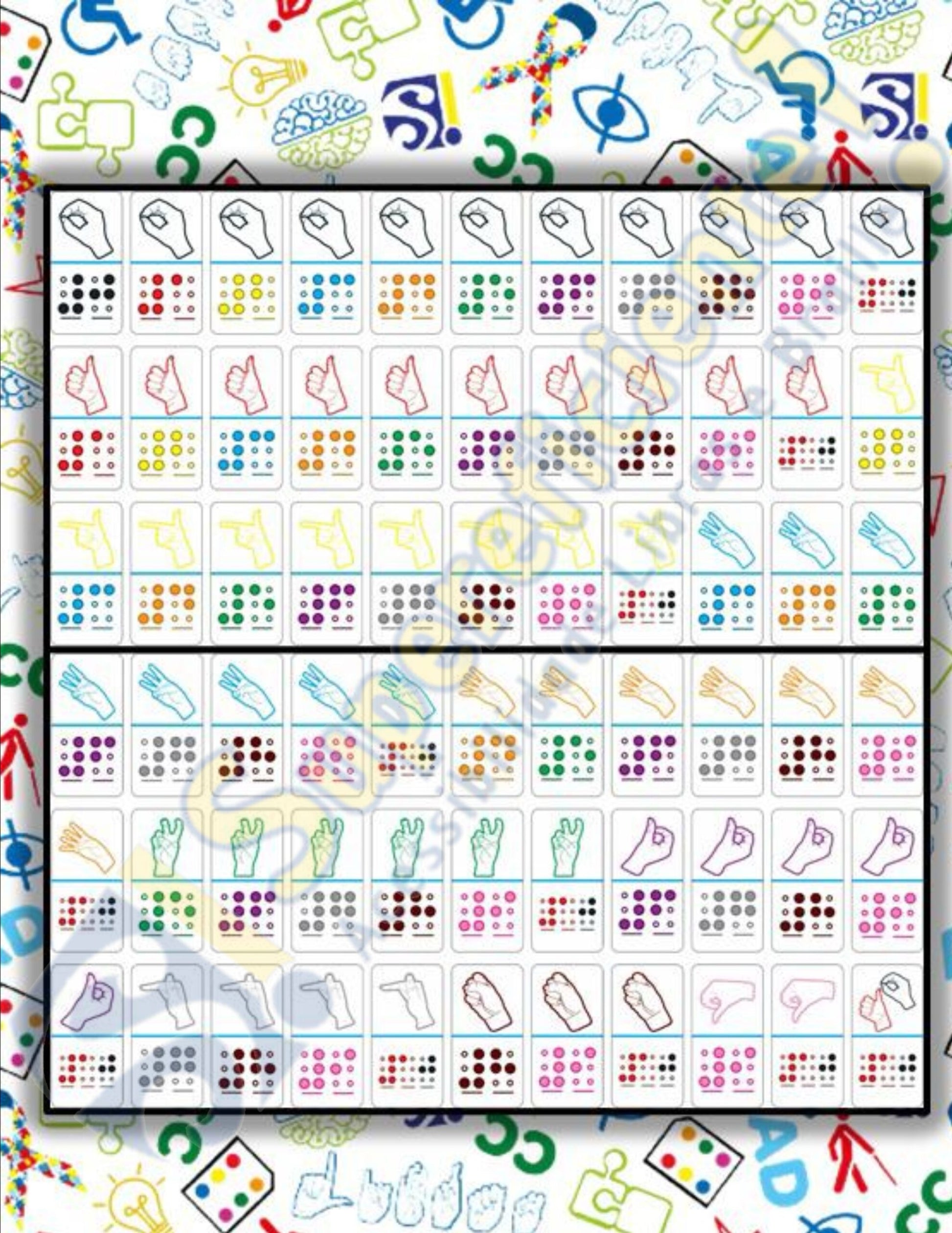 O DOMINÓ LIBRAS X BRAILLE VISUAL SUPEREFICIENTE 0-10, possui 66 peças coloridas diferentes. É confeccionado em MDF 3mm e cada peça no tamanho 30x60mm, cantos arredondados com corte laser.